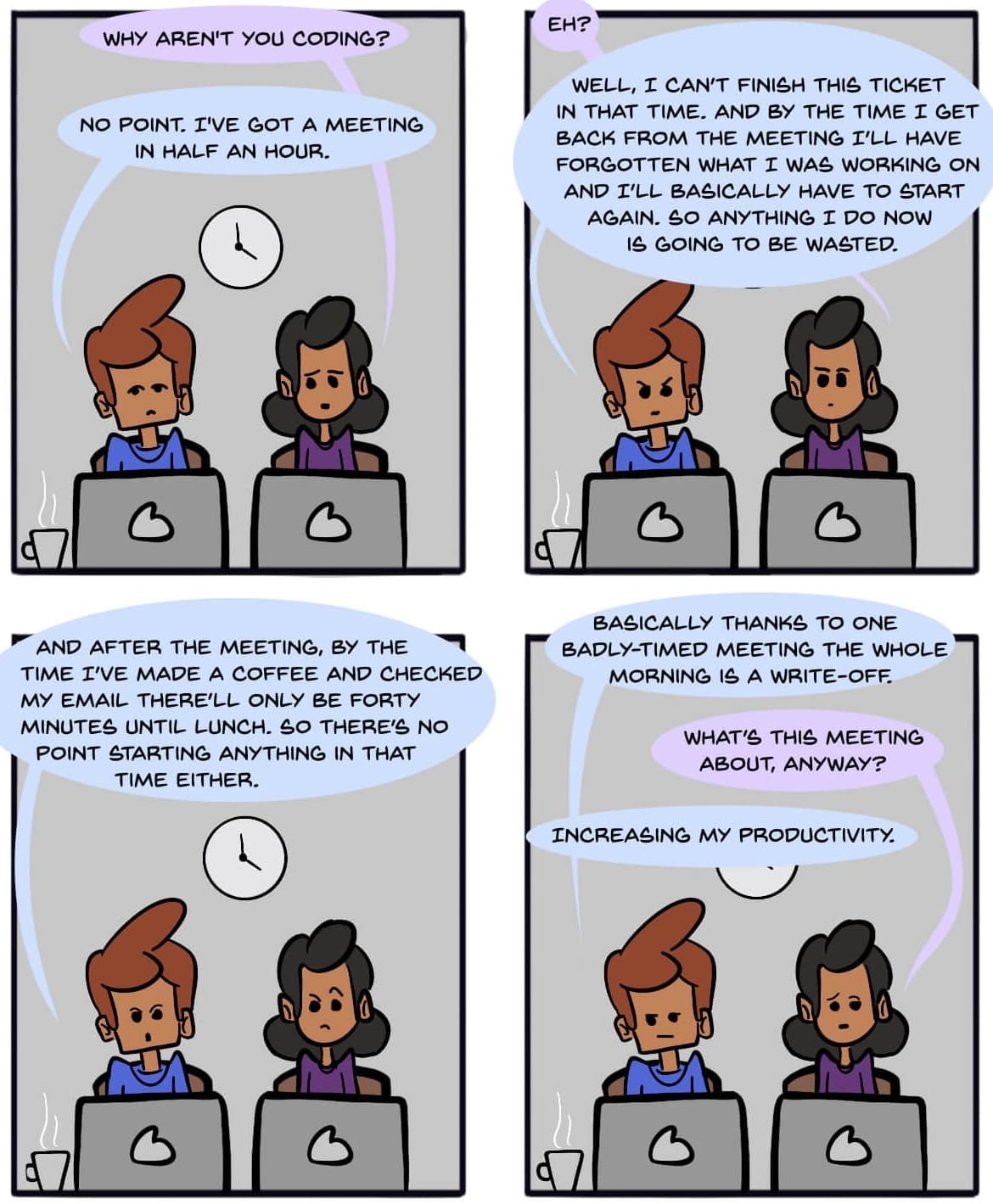 Too many standups, design meetings, and status updates spread throughout the day fragment a developer’s calendar. Even beneficial practices, like daily standups with the , can contribute to context switching if not scheduled wisely. Every meeting forces developers to leave their current context behind, increasing the context switching cost and limiting the time spent on focused coding sessions.